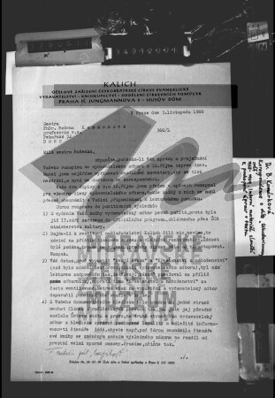 Dopis z vydavatelství Českobratrské církve evangelické Kalich adresovaný Boženě Komárkové, korespondence o jejím díle Sekularizovaný svět a evangelium, listopad 1968.
